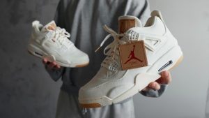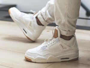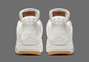 Another key detail is the tongue tag. Instead of Levi’s classic “Two Horses” patch, it features the iconic Jumpman logo. This clever branding fusion highlights the collaboration’s attention to detail. Additionally, the gum rubber outsole offers a warm contrast to the white denim, enhancing its street-ready style.